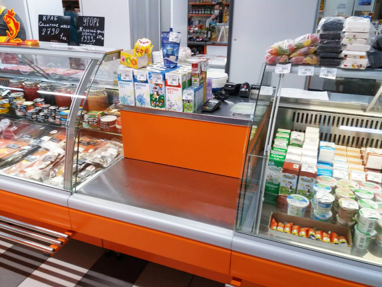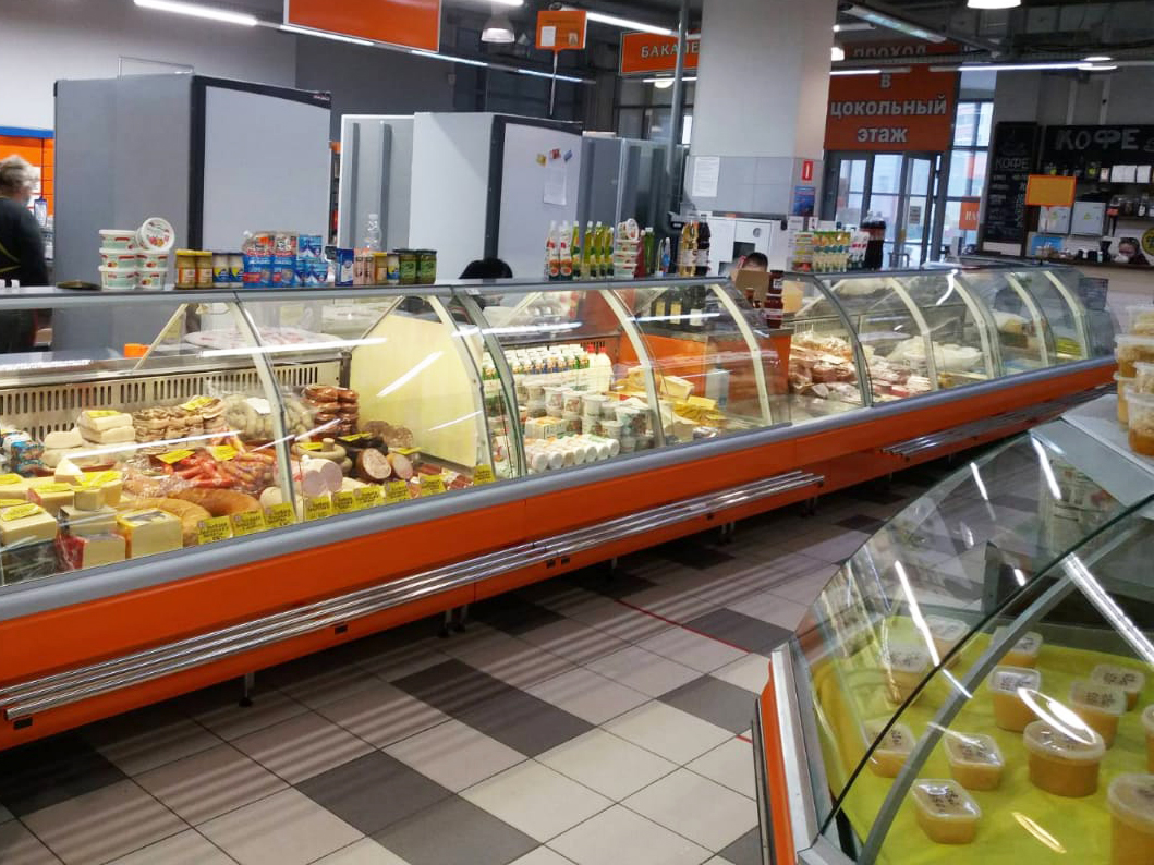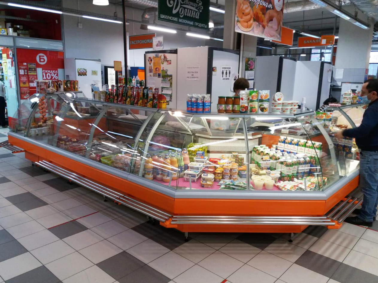 Яркие оранжевые витрины Lida-Midi для продуктового рынка Верхнепечёрский