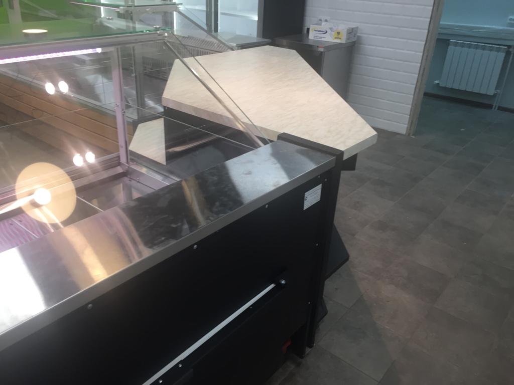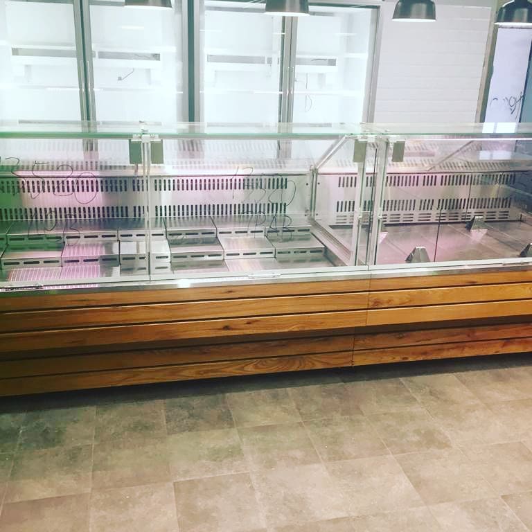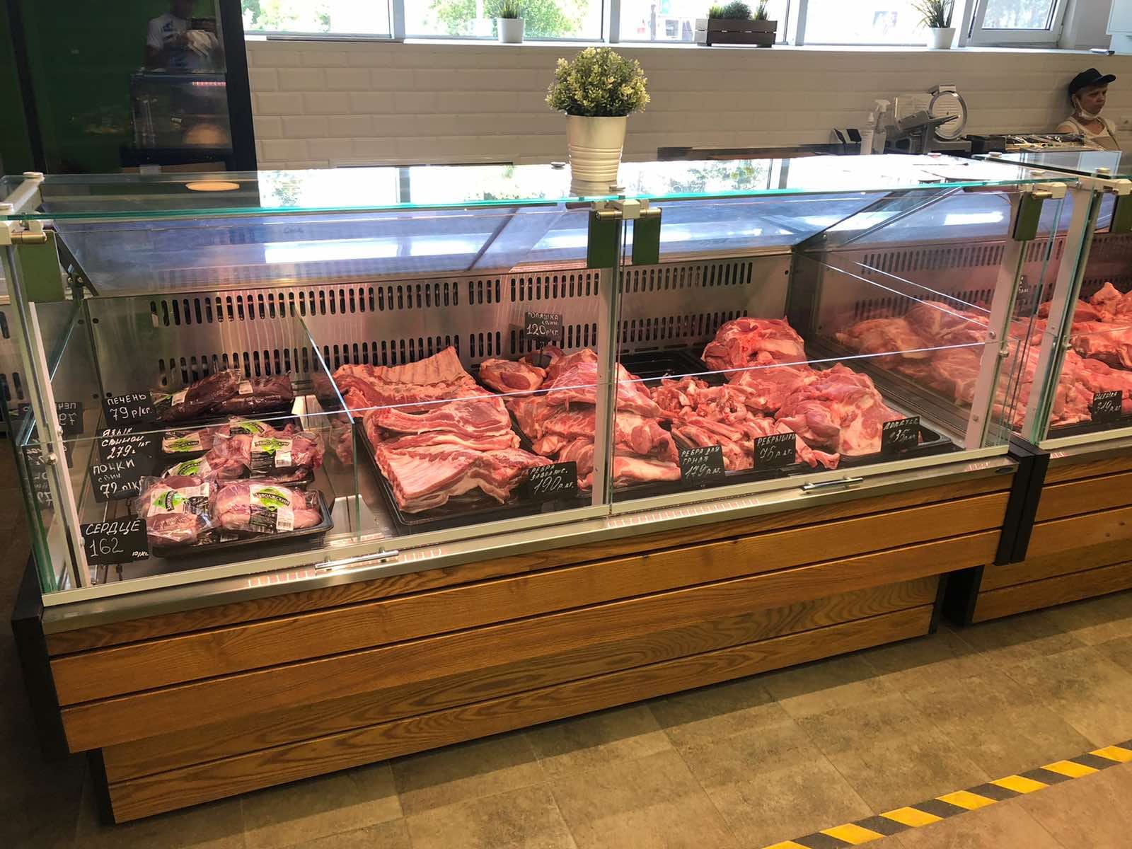Согласно техническому заданию витрины выполнены с применением внешней отделки натуральным массивом из ясеня. Улучшенная система охлаждения и особое размещение агрегатов позволяет качественно работать и сохранять мясной продукции внешний товарный вид.