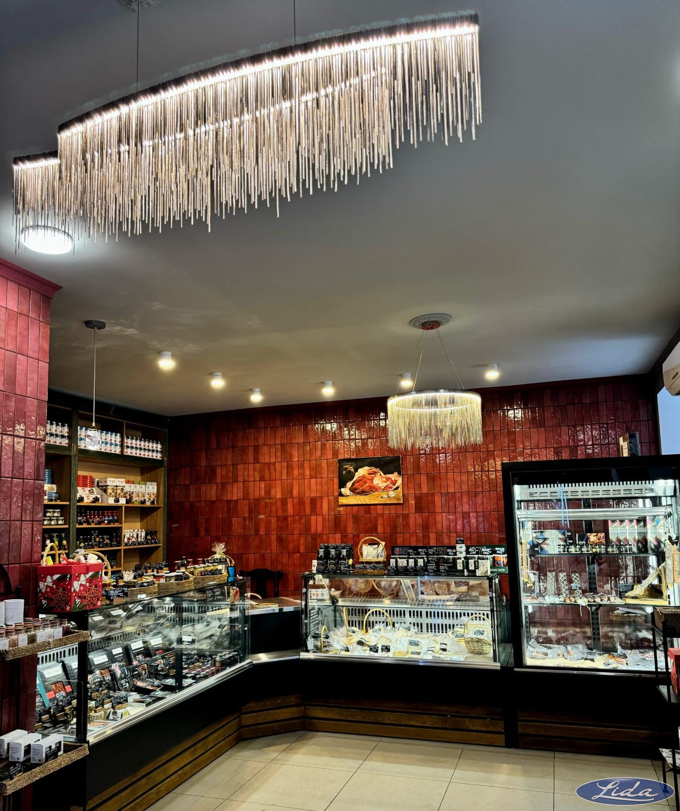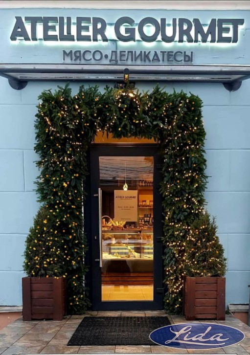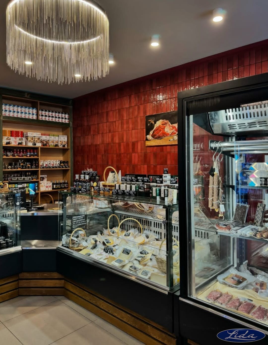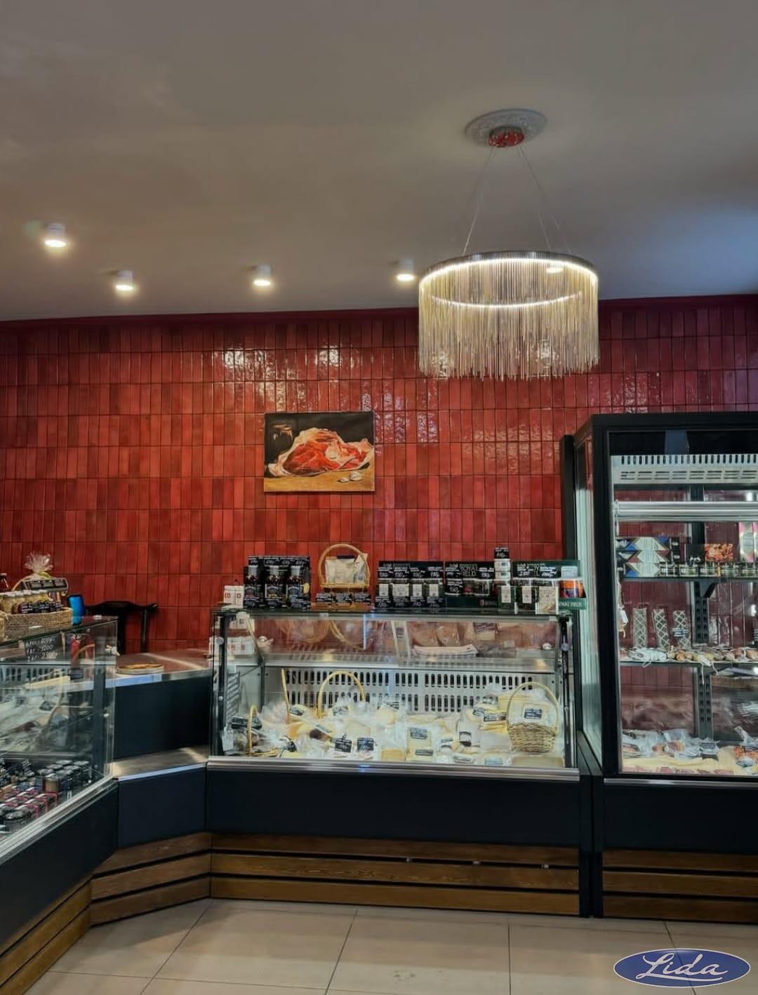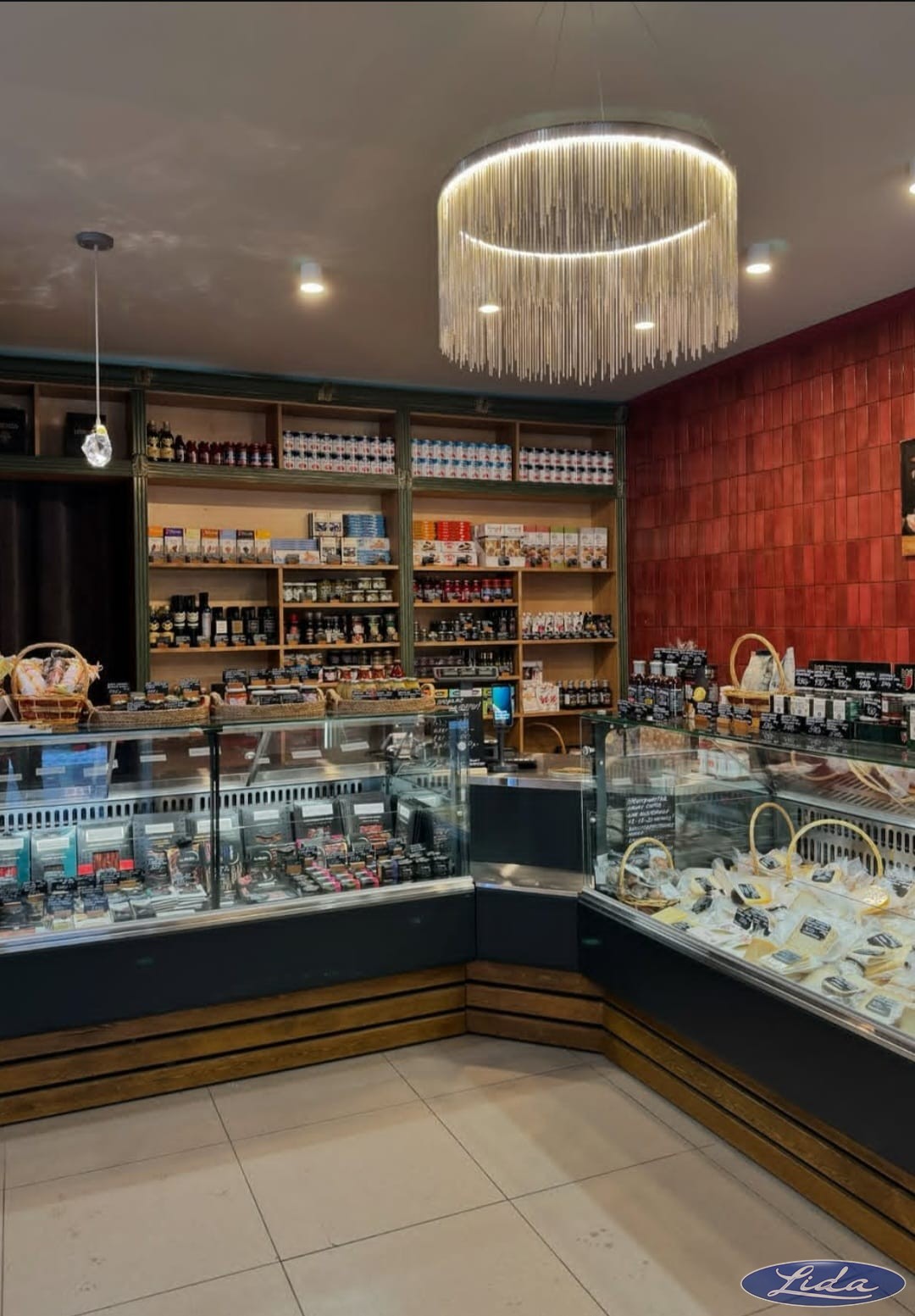 На объекте представлены: витрины с прямым стеклом - Lida K с зашивкой натуральным деревом; витрина Lida-Ispania.