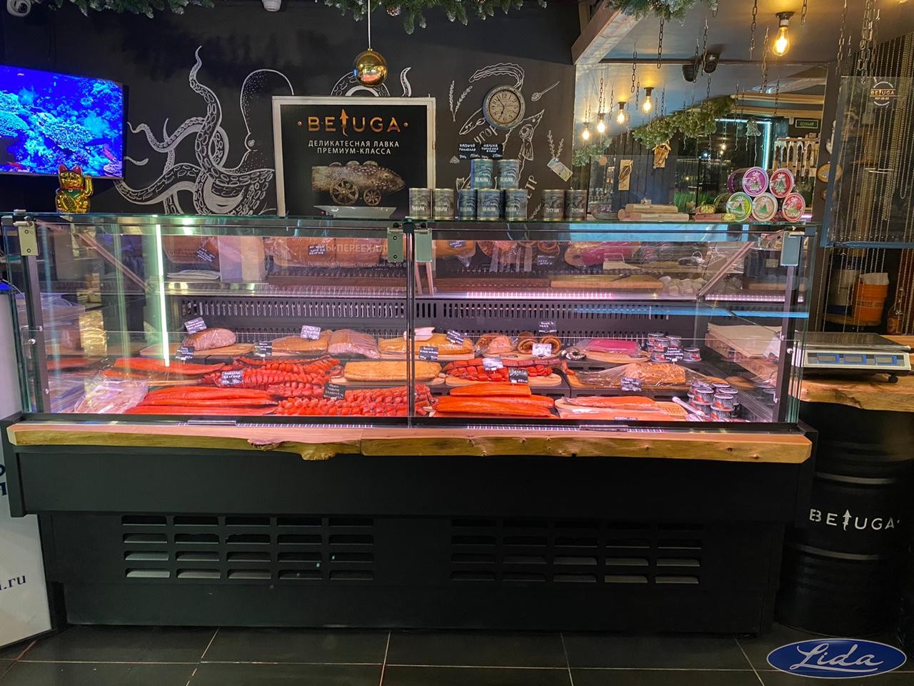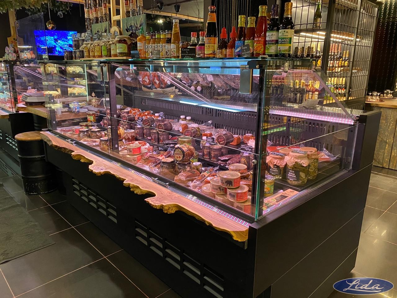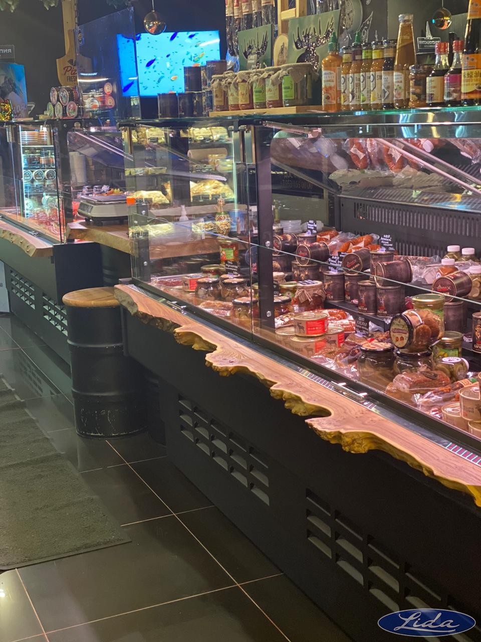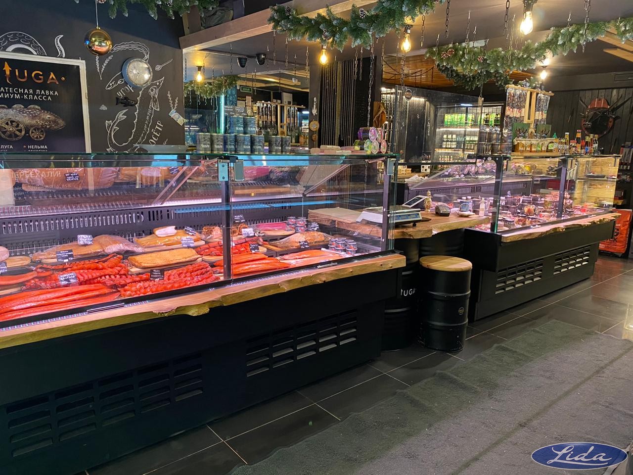 На данном объекте установлено торгово-холодильное оборудование LIDA KUB на встроенном холоде и с увеличенным подиумом. Внутренняя часть витрин выполнена полностью из нержавеющей стали и дополнительно окрашена.