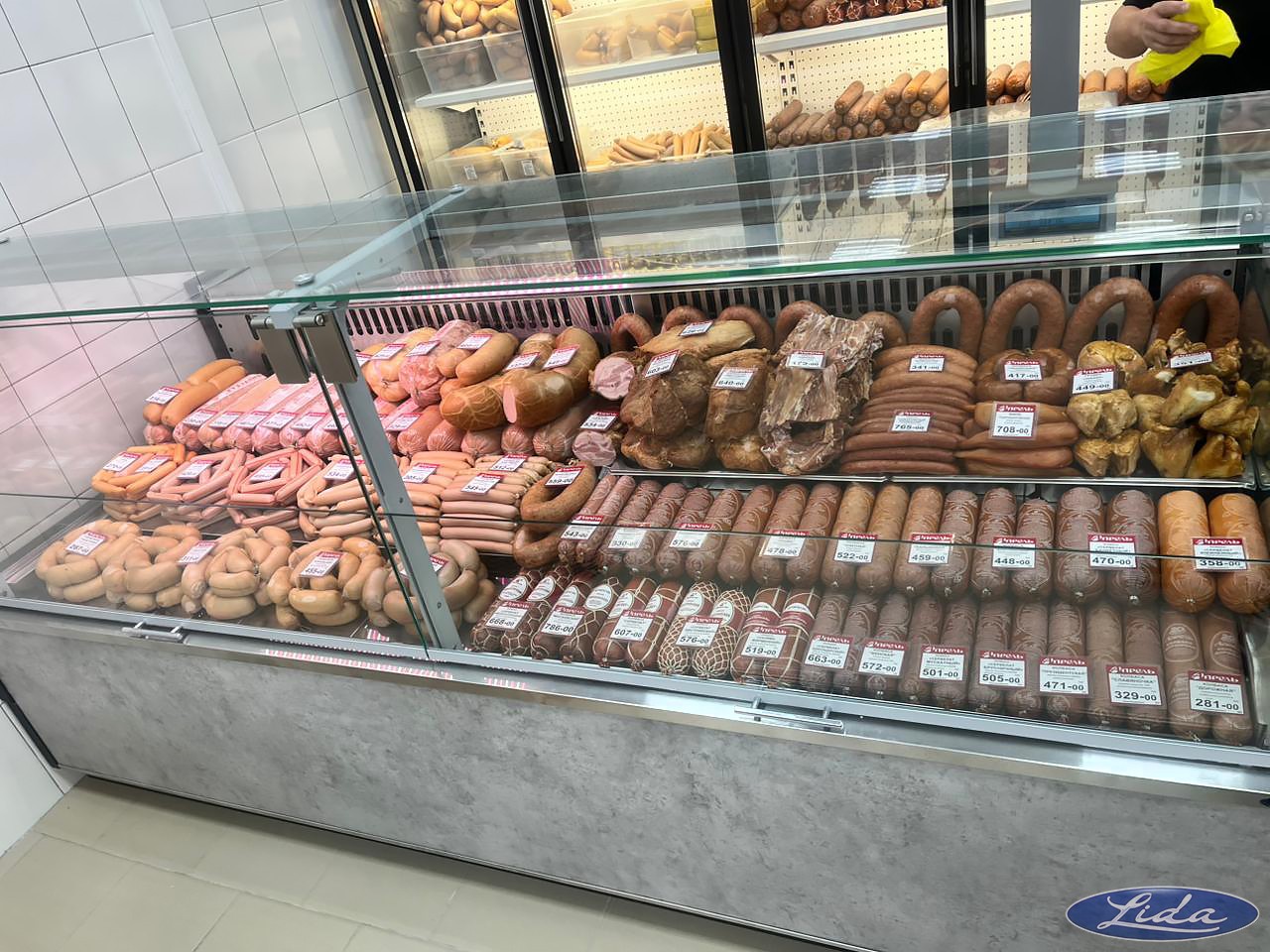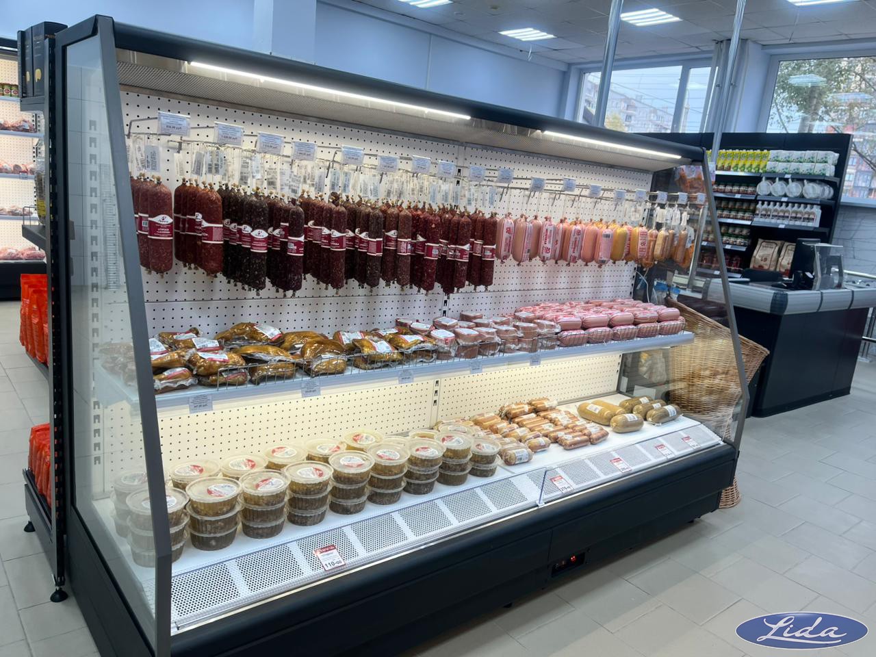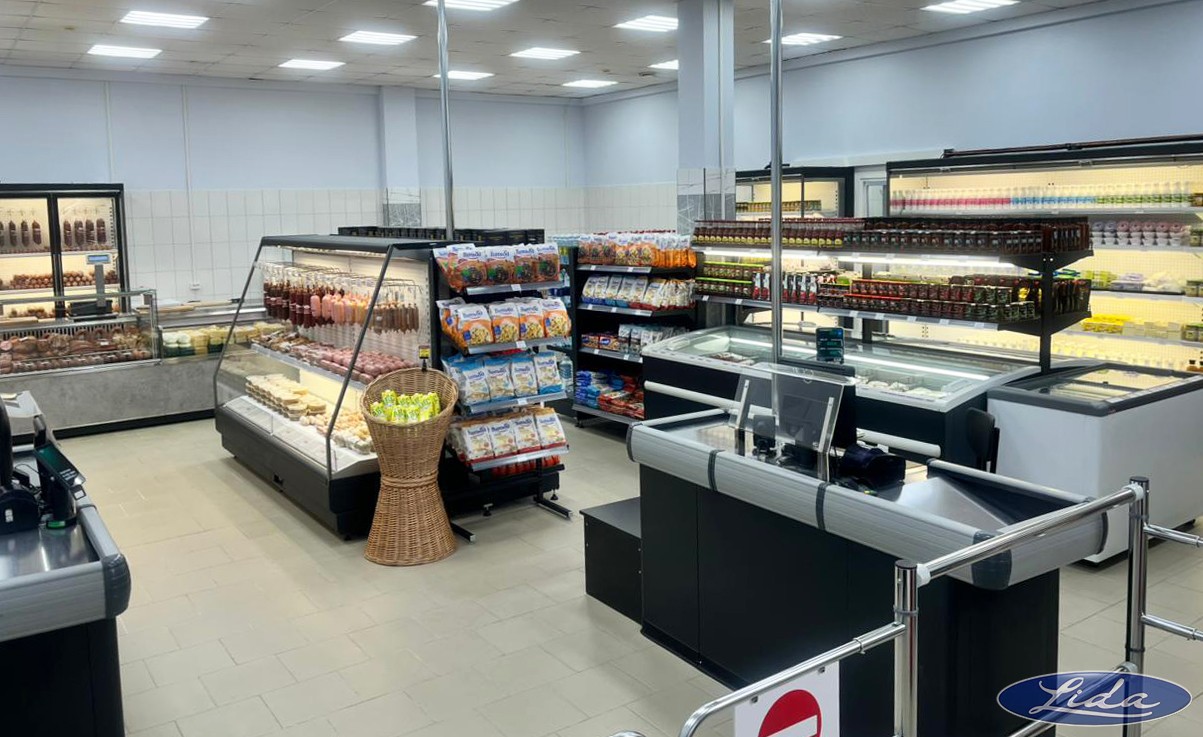 Здесь установлены витрины LIDA-KUB в обновленном дизайне с фронтальной зашивкой, гастрономические горки LIDA-STELLA открытого типа с ночной шторкой и с дверьми (в прилавочной зоне), а также торговые стеллажи производства завода "Иней" в индивидуальном цвете.