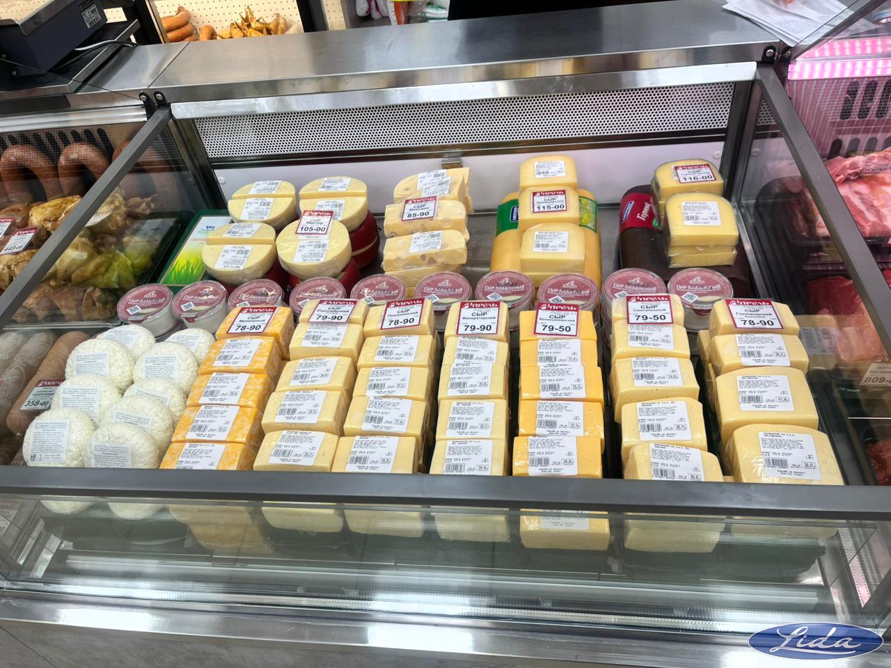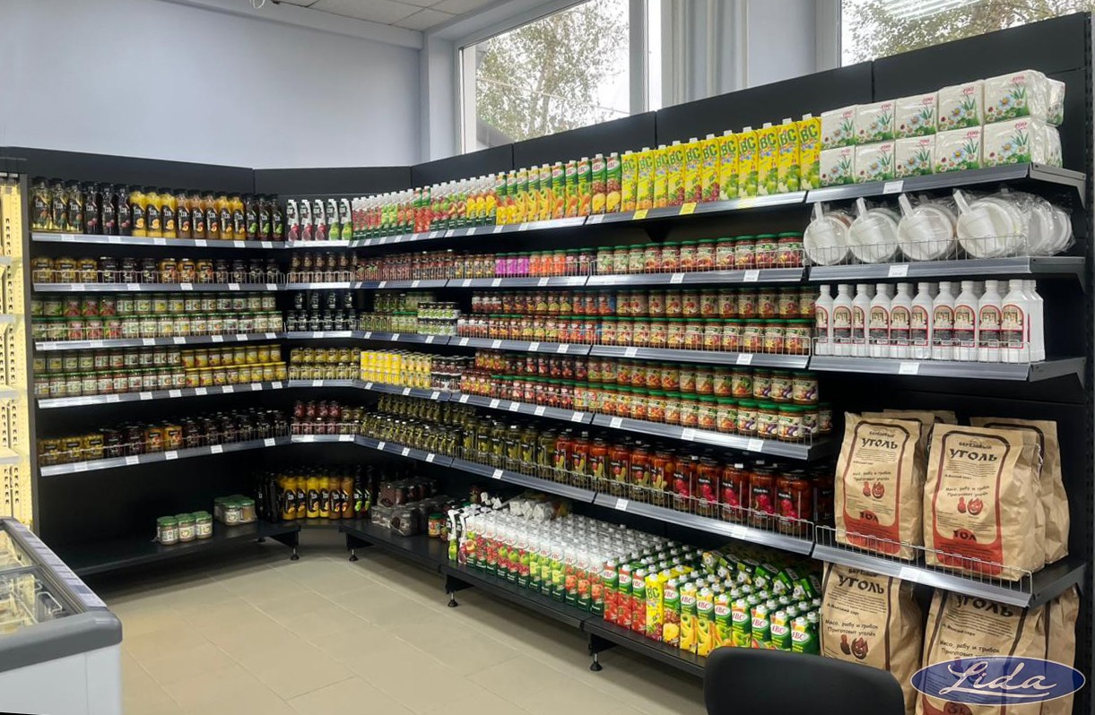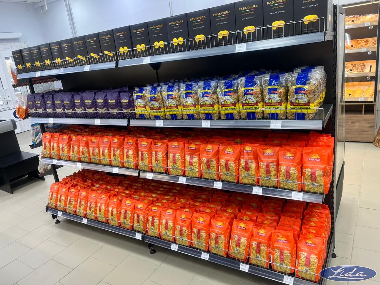 Здесь установлены витрины LIDA-KUB в обновленном дизайне с фронтальной зашивкой, гастрономические горки LIDA-STELLA открытого типа с ночной шторкой и с дверьми (в прилавочной зоне), а также торговые стеллажи производства завода "Иней" в индивидуальном цвете.