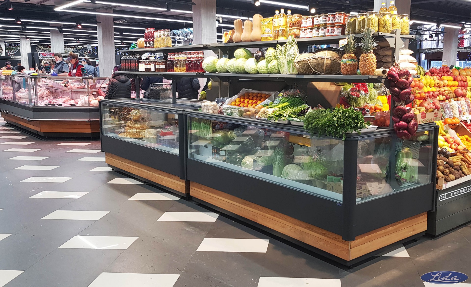 овощные развалы и стеллажи.