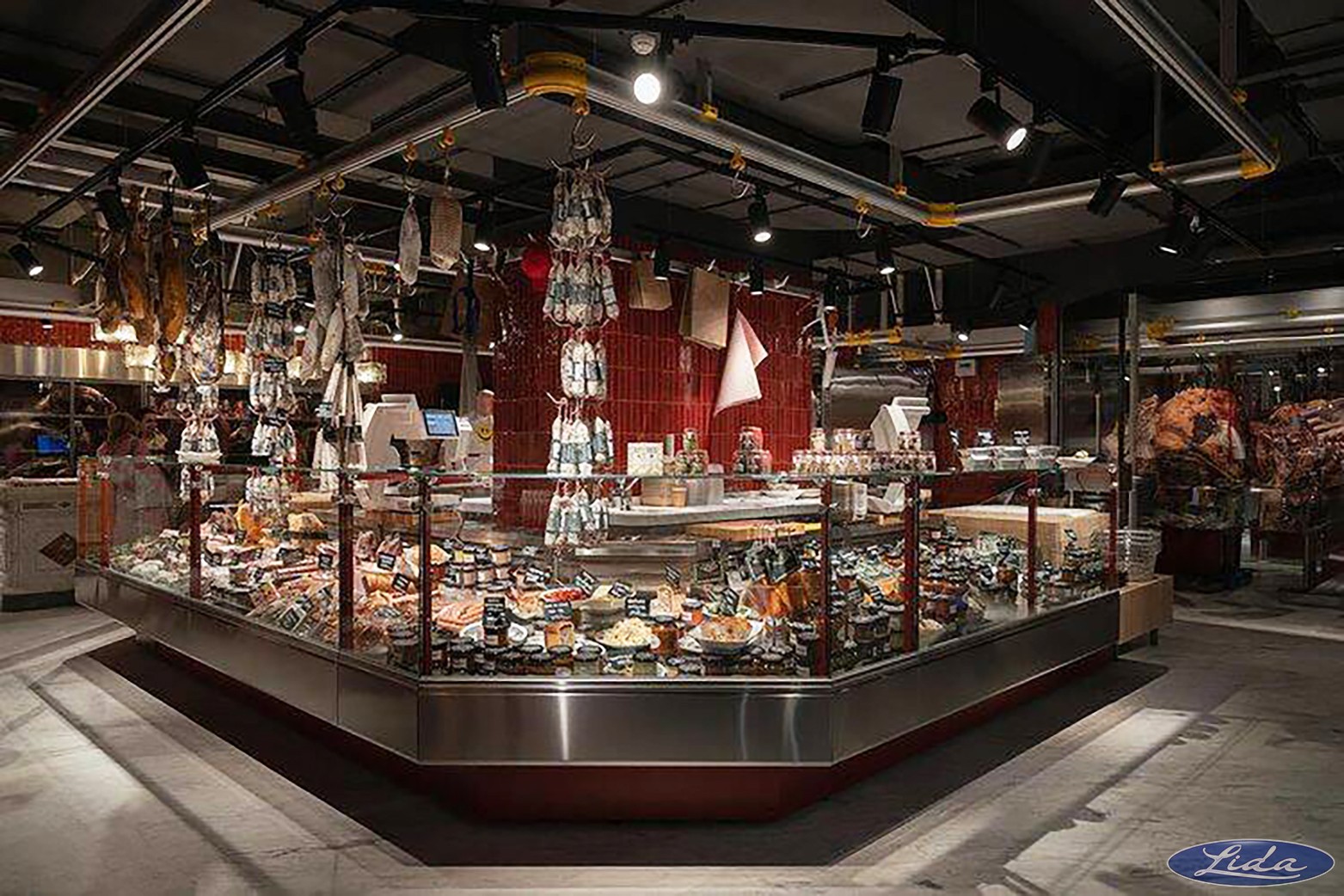 Витрины холодильные LIDA были изготовлены под индивидуальный заказ с определенными габаритными размерами, глубиной выкладки 900 мм, полностью из нержавеющей стали, особое остекление.