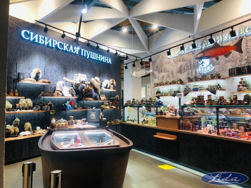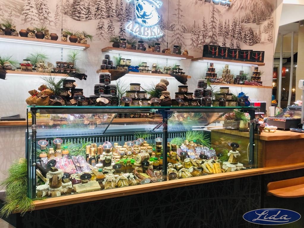 Витрины Lida K с увеличенной выкладкой товара, цвет 7024 RAL для магазина "Сибирские деликатесы", который находится в аэропорту г. Екатеринбург